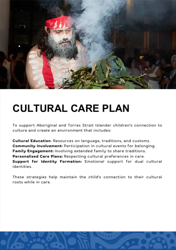 Our Cultural Care Plan Booklet documents each child or young person’s cultural identity, including their mob, totems, Country, language, ceremonies and history. They also include information about biological parents, siblings and extended family, a family history tree, a family and community consultation chart, photos, and connections to local Aboriginal organisations and cultural activities to support ongoing connection to culture, community and kinship.
